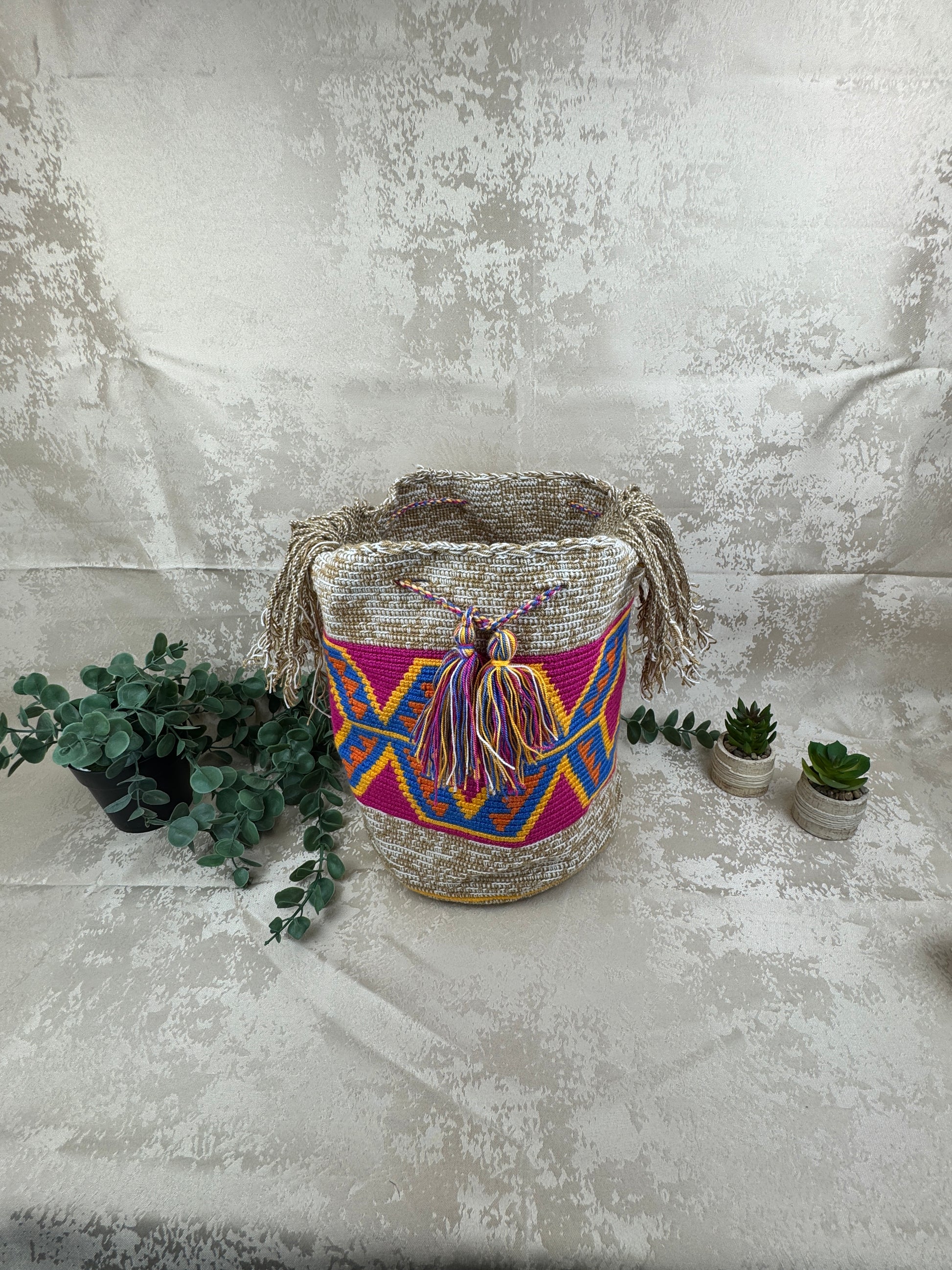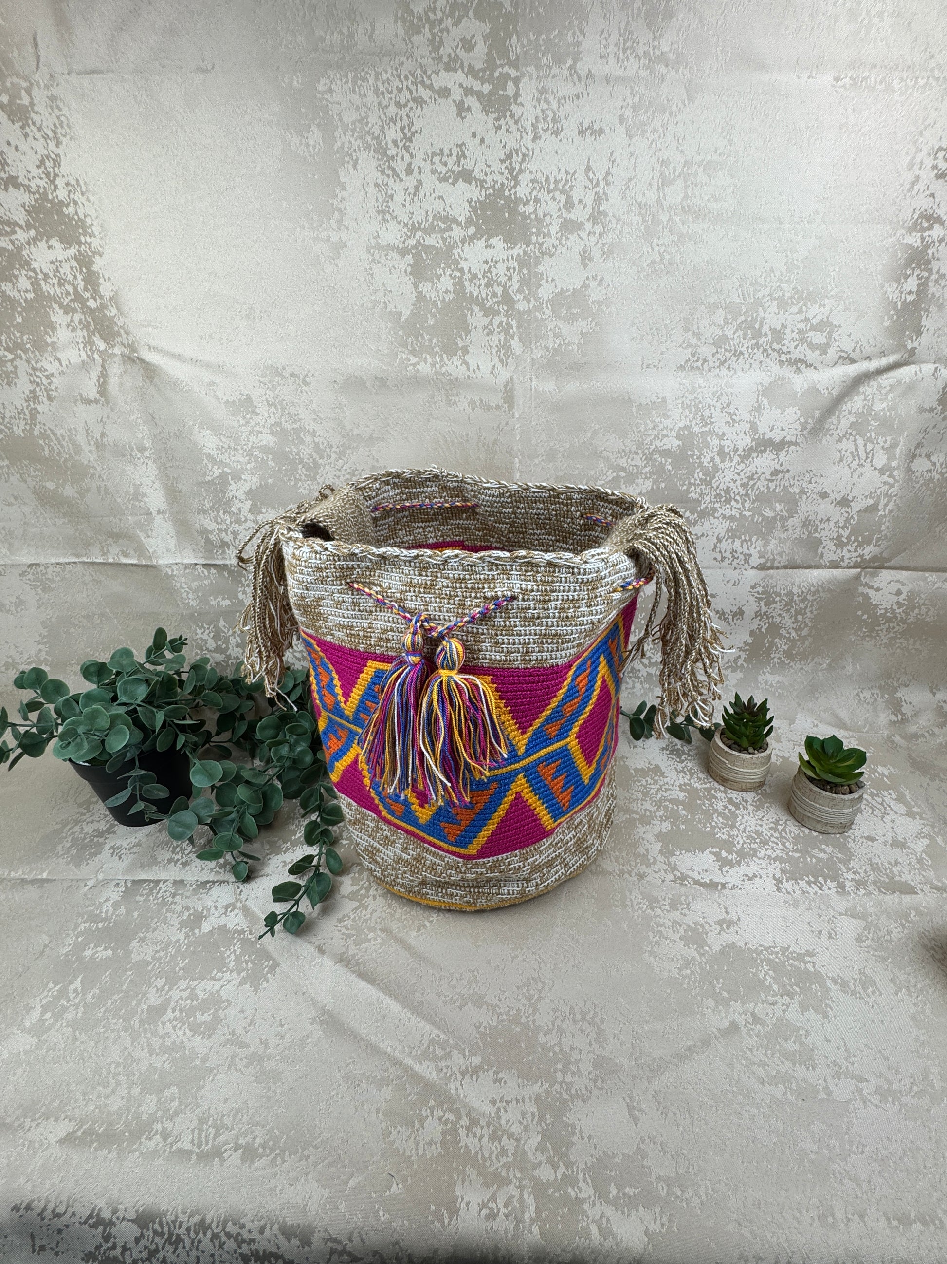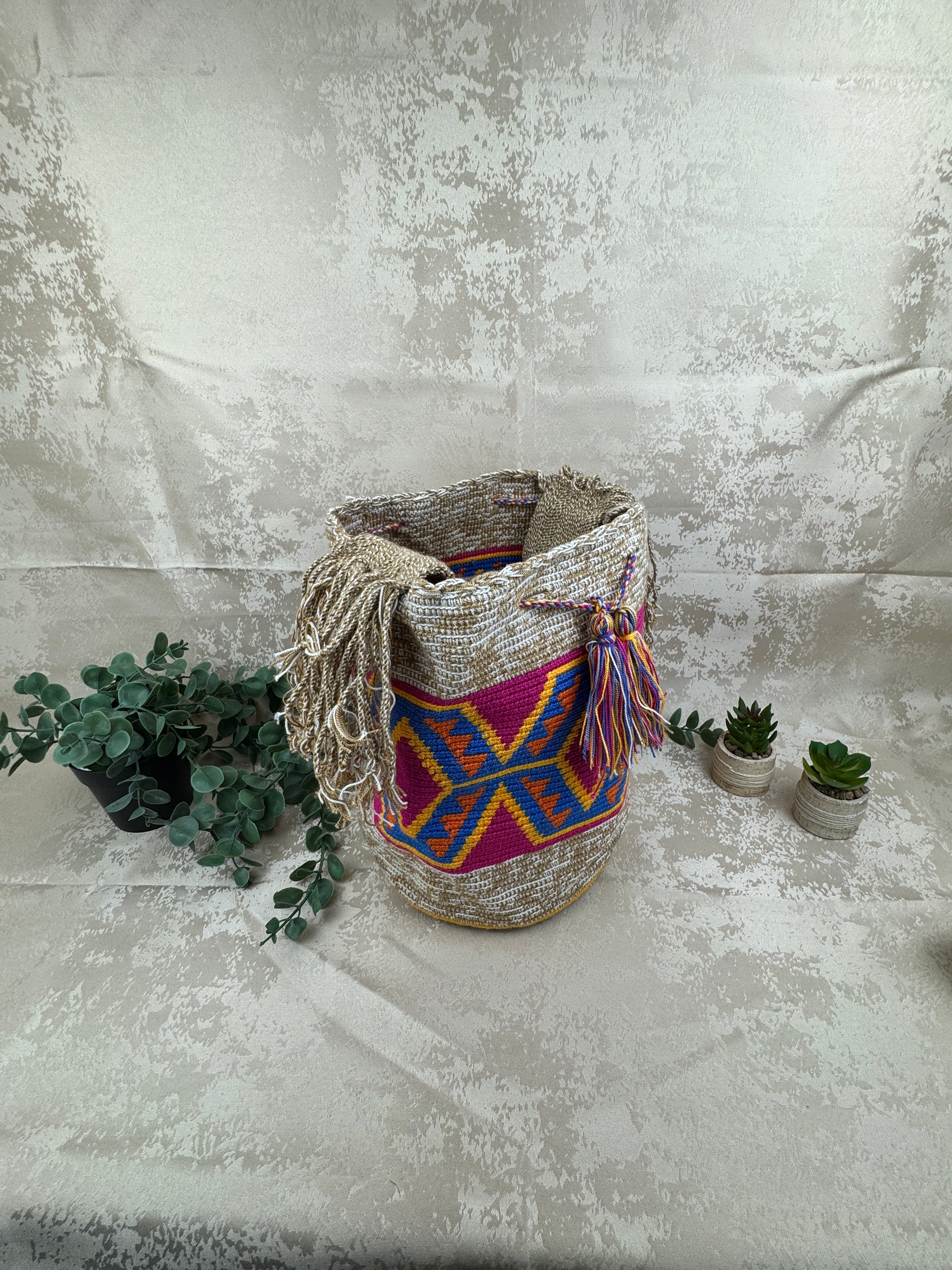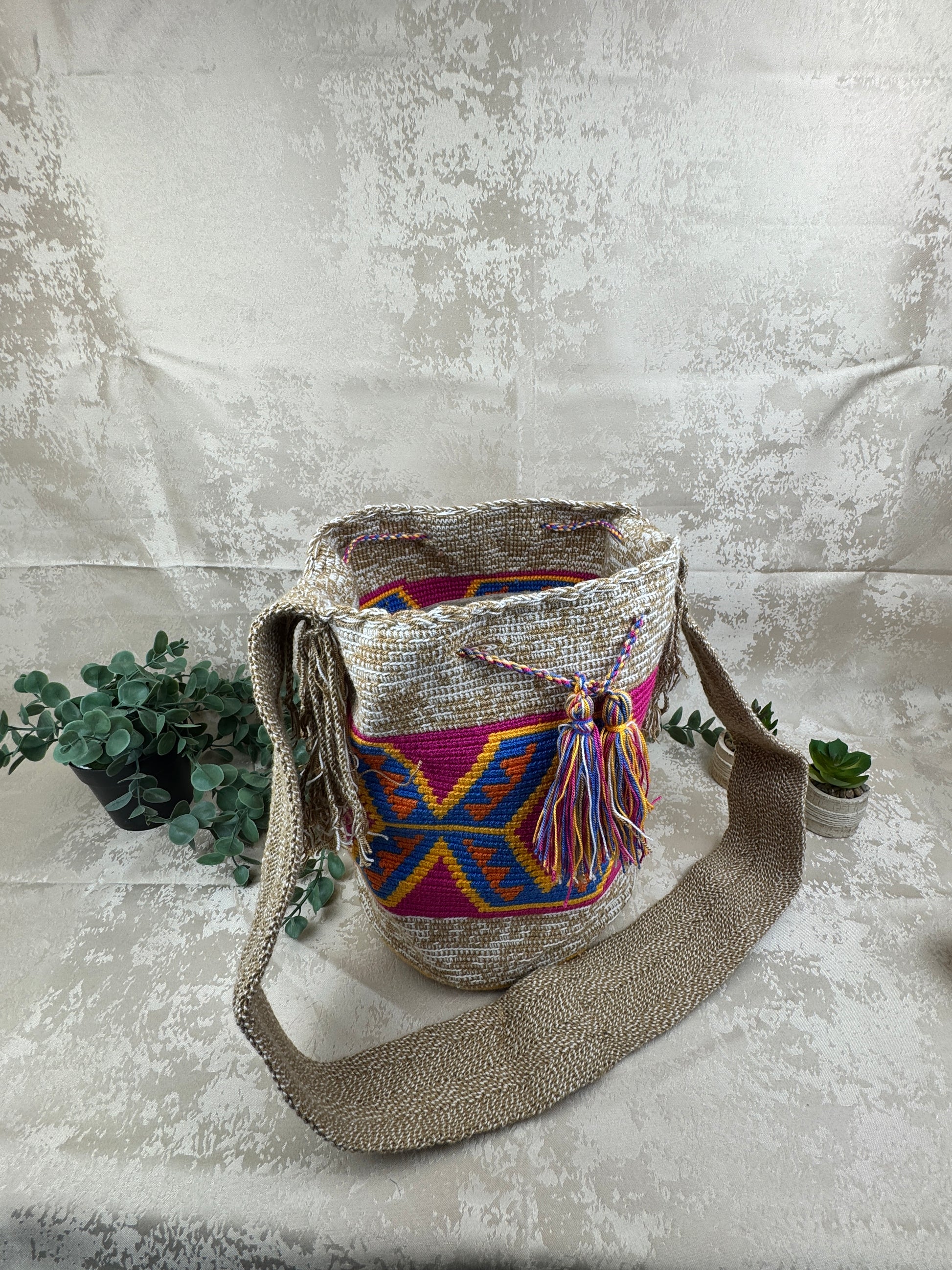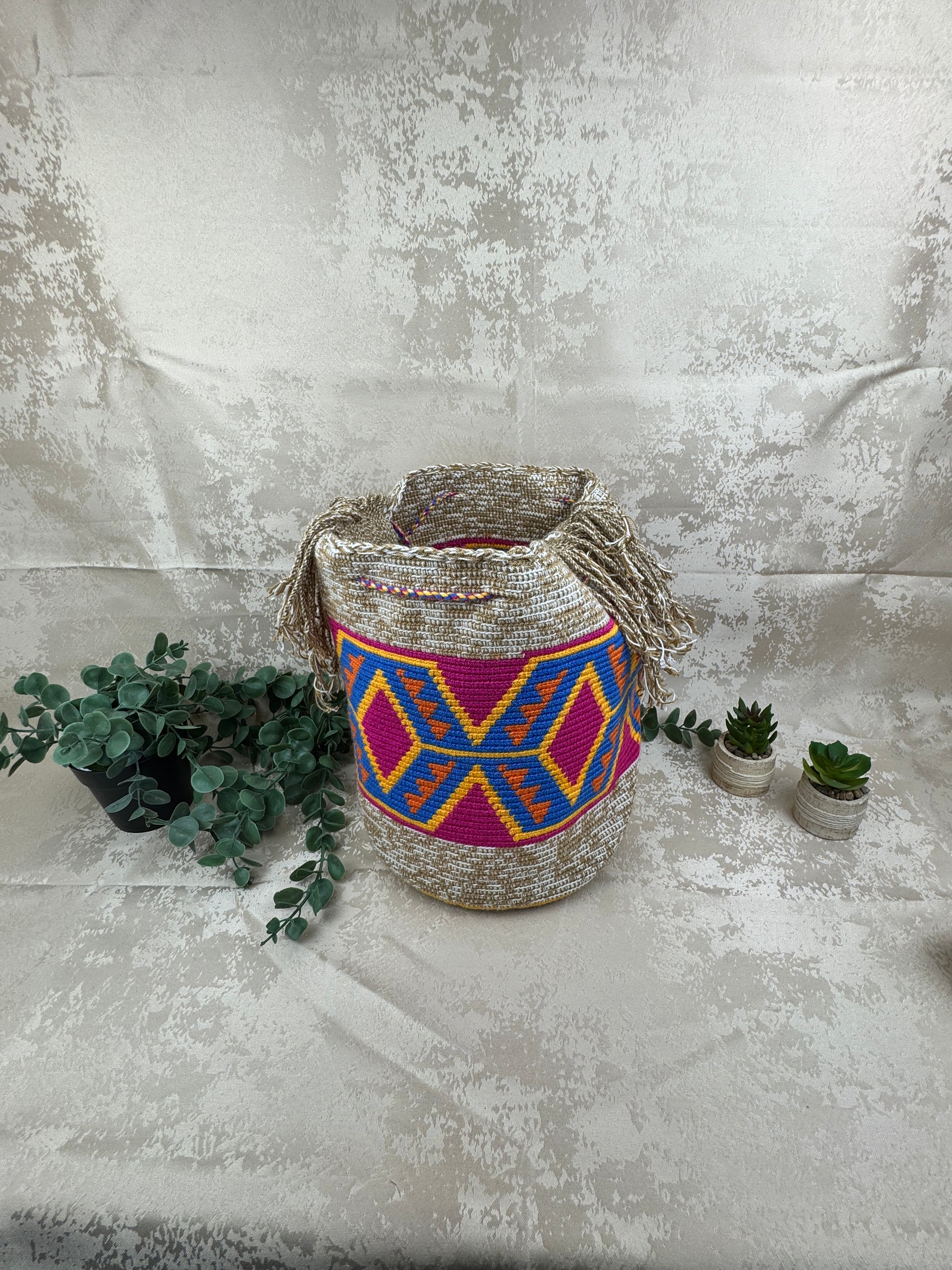 Su diseño geométrico multicolor no es solo decoración: es identidad. Los Wayuu tejen lo que viven, lo que ven y lo que sueñan. Una mochila de este tamaño refleja abundancia y protección, pensada para acompañar el día completo—del mercado al viaje, de la ciudad al mar. La banda ancha tejida a mano asegura comodidad y resistencia, mientras los flecos y borlas añaden movimiento y alegría, rasgos esenciales de la estética Wayuu.