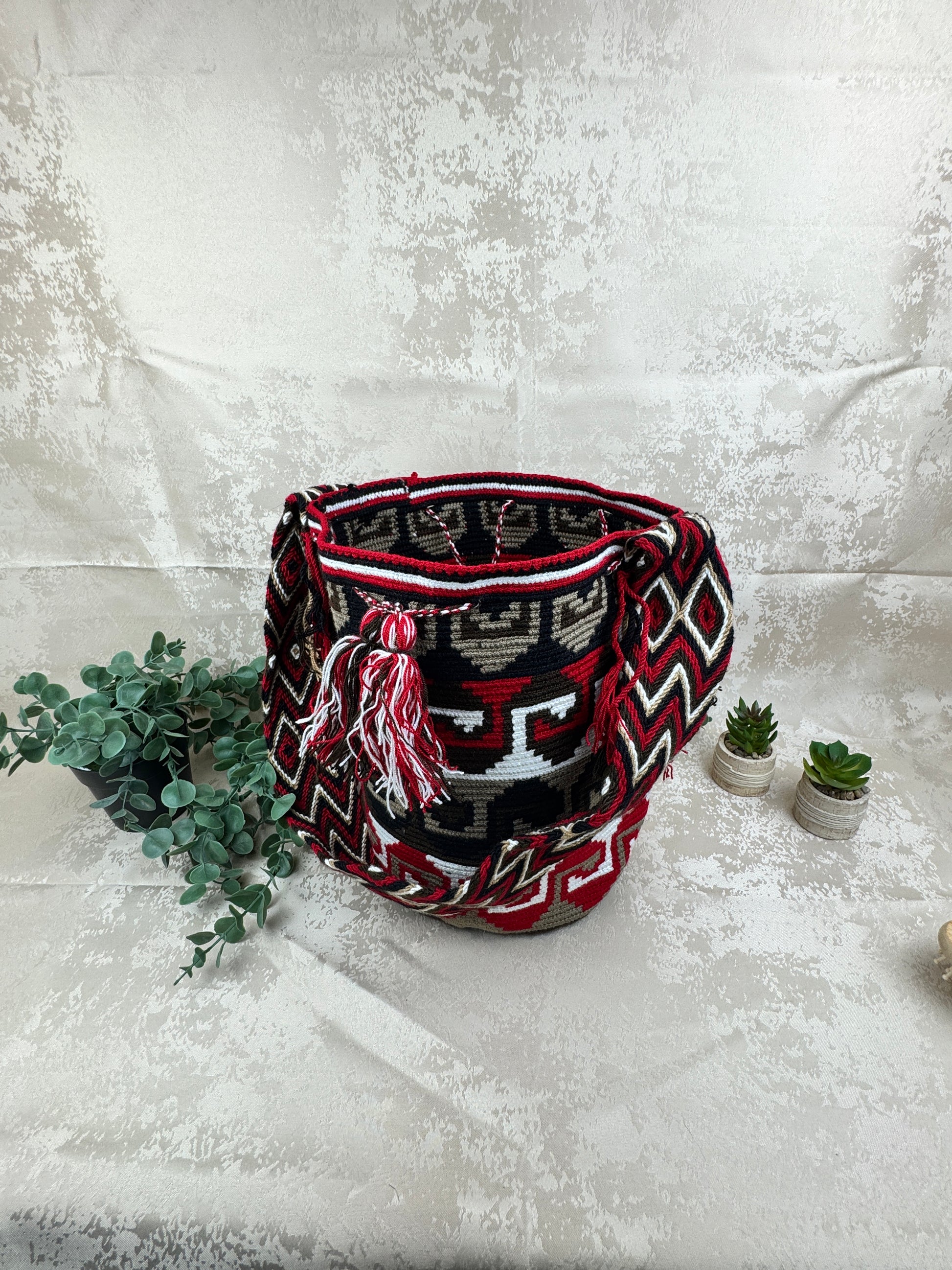 Su diseño geométrico multicolor no es solo decoración: es identidad. Los Wayuu tejen lo que viven, lo que ven y lo que sueñan. Una mochila de este tamaño refleja abundancia y protección, pensada para acompañar el día completo—del mercado al viaje, de la ciudad al mar. La banda ancha tejida a mano asegura comodidad y resistencia, mientras los flecos y borlas añaden movimiento y alegría, rasgos esenciales de la estética Wayuu.