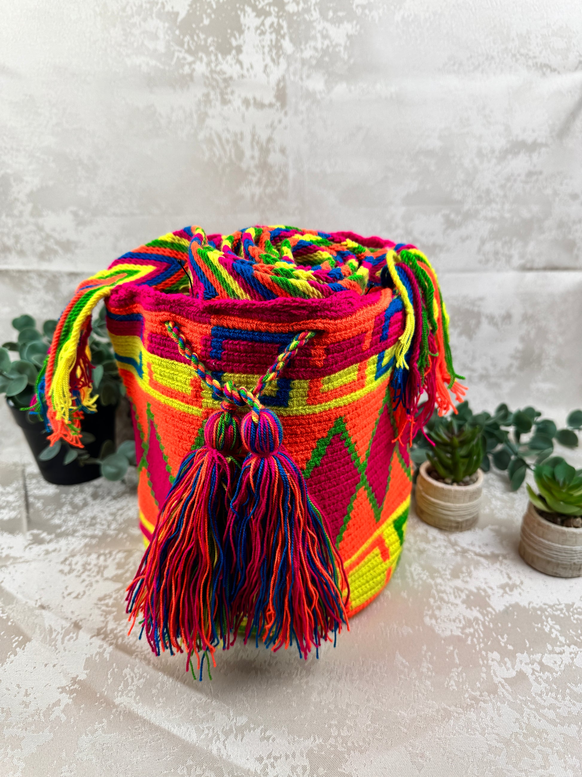 Esta hermosa mochila Wayuu mediana es una obra de arte tejida completamente a mano por mujeres del pueblo Wayuu en la península de La Guajira, Colombia. Cada punto, cada color y cada figura geométrica —conocida como kanaas— refleja la identidad cultural de la artesana que la creó.