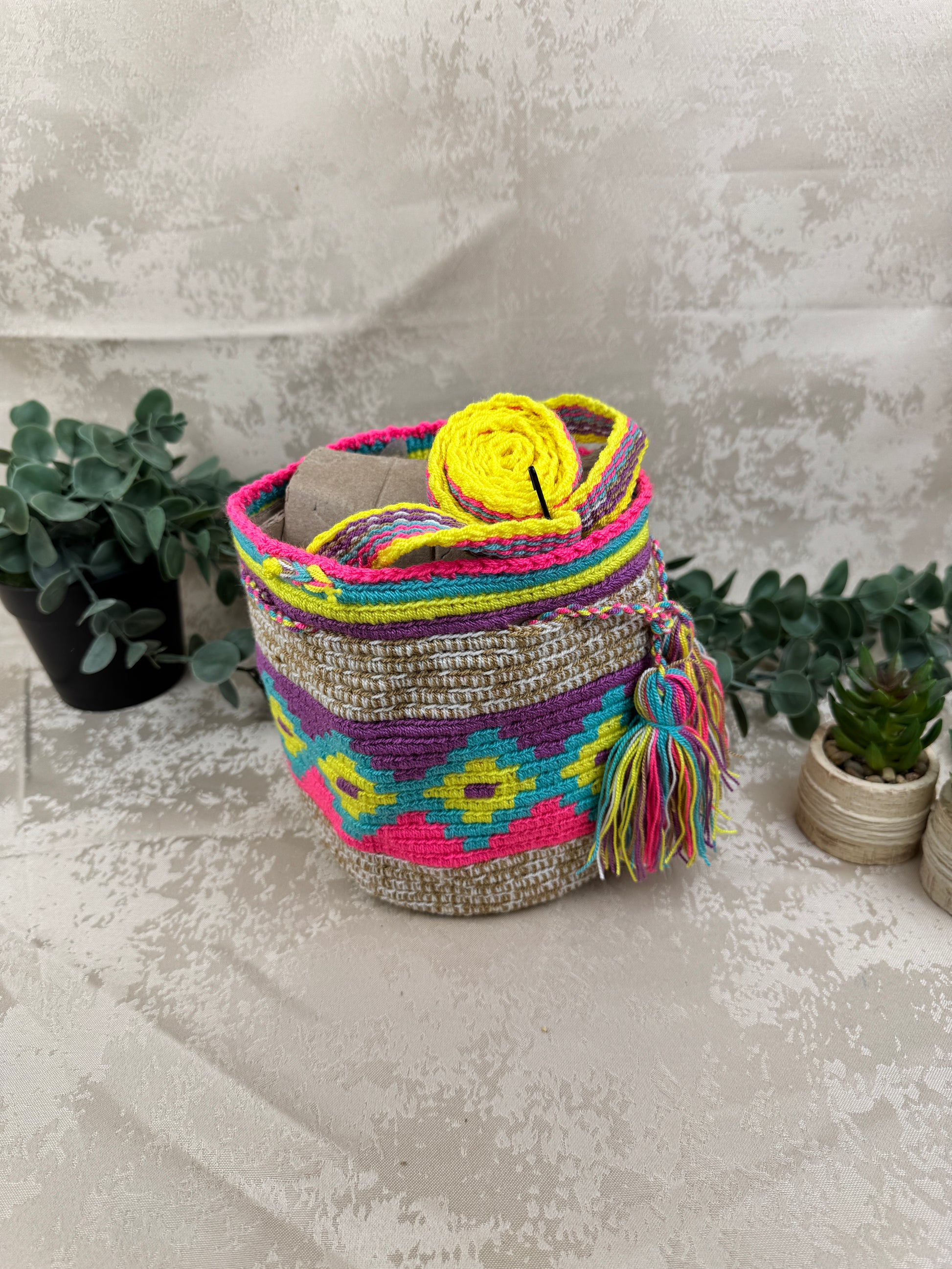 Tejida completamente a mano en La Guajira, Colombia, cada Susuchon requiere días de trabajo cuidadoso, donde la artesana entrelaza hilos, colores y símbolos que representan su territorio, su identidad y su memoria cultural.